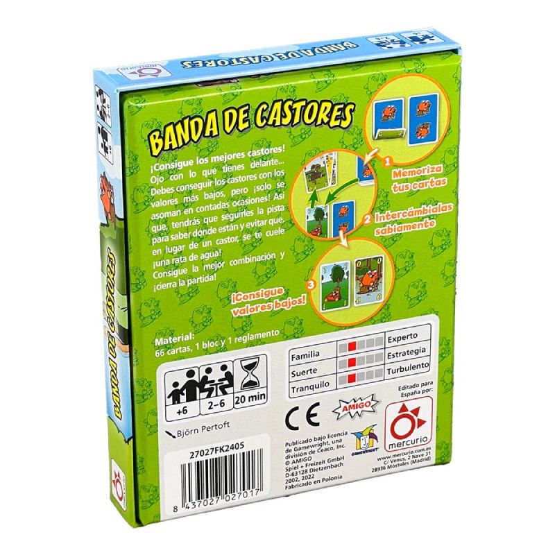 Con reglas sencillas, partidas rápidas y una buena dosis de memoria y faroleo, Banda de Castores es perfecto para jugar en familia o con amigos. ¡Prepárate para reír, sorprender y calcular como un auténtico castor estratega!