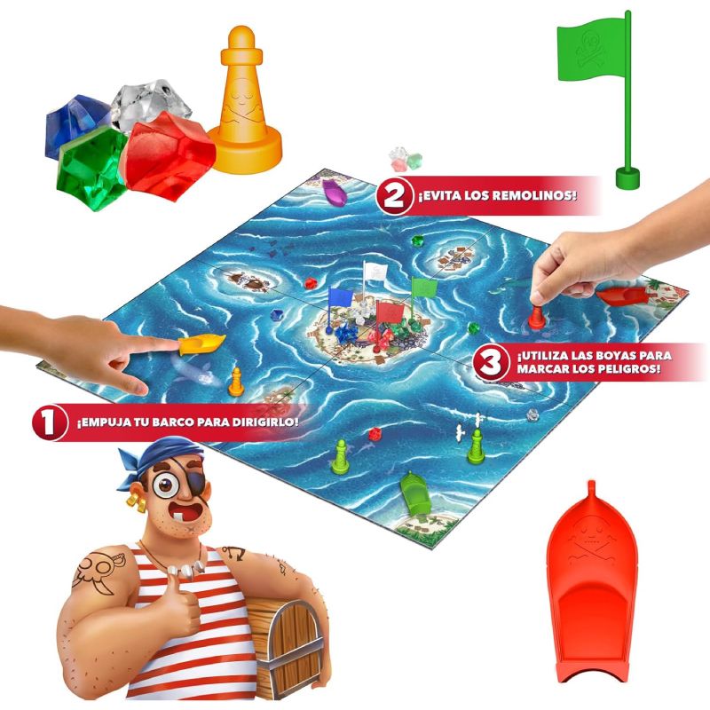 - Navegación: Cada jugador comienza desde su base y, utilizando un solo dedo, empuja su barco magnético a través del tablero con el objetivo de llegar a la isla central para recoger tesoros. Durante la travesía, deberás evitar los remolinos ocultos que pueden hacer que tu barco se hunda y pierdas los tesoros recolectados.