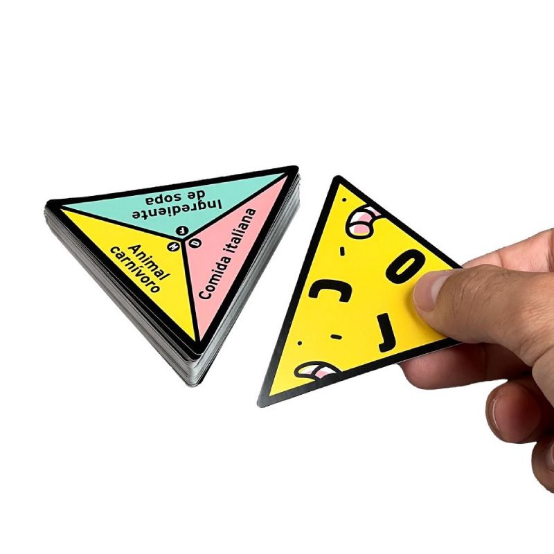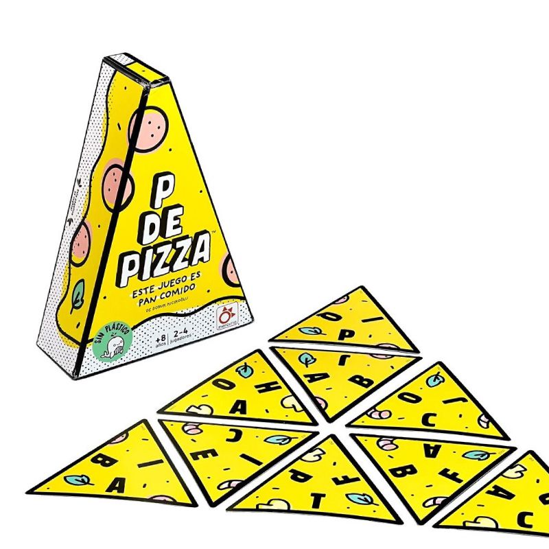 P de Pizza es un juego de agilidad mental donde cada carta triangular muestra tres retos (fácil, medio y difícil). Se revela una letra inicial y una categoría; el primero en decir una palabra que empiece por esa letra y encaje con la categoría se queda la carta.