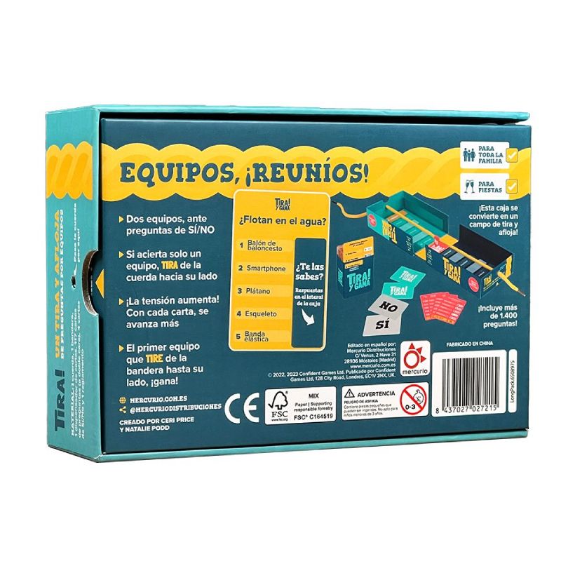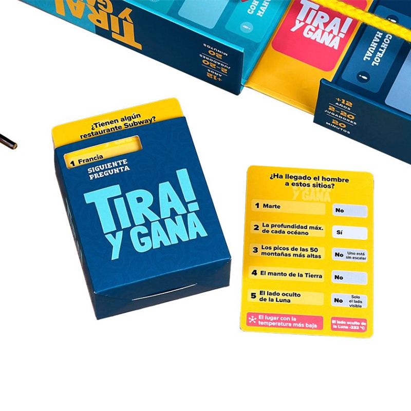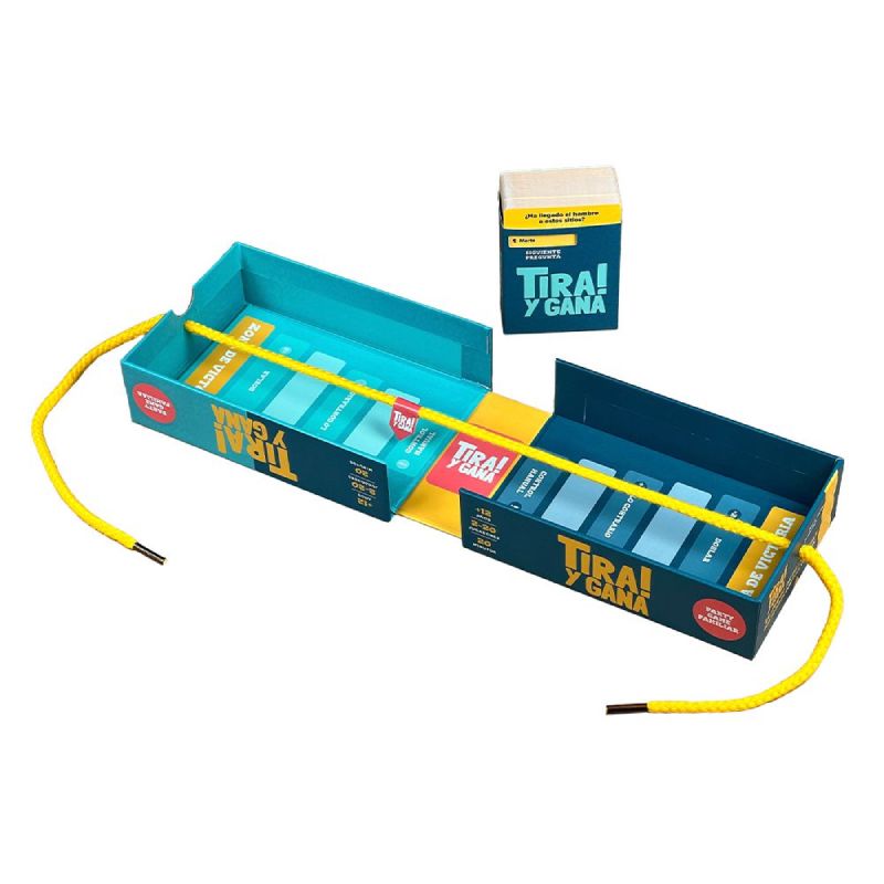 Tira y Gana es un juego de mesa que se juega por equipos y que combina preguntas tipo sí/no con el clásico tira y afloja. Si tu equipo responde correctamente mientras el otro falla, ¡podemos tirar de la cuerda hacia nuestra zona! Ideal para fiestas, reuniones familiares o dinámicas de equipo.